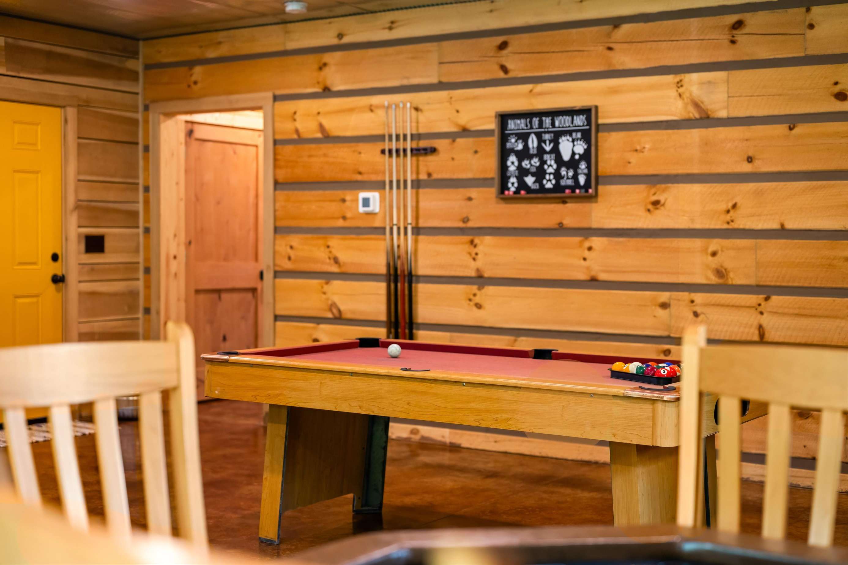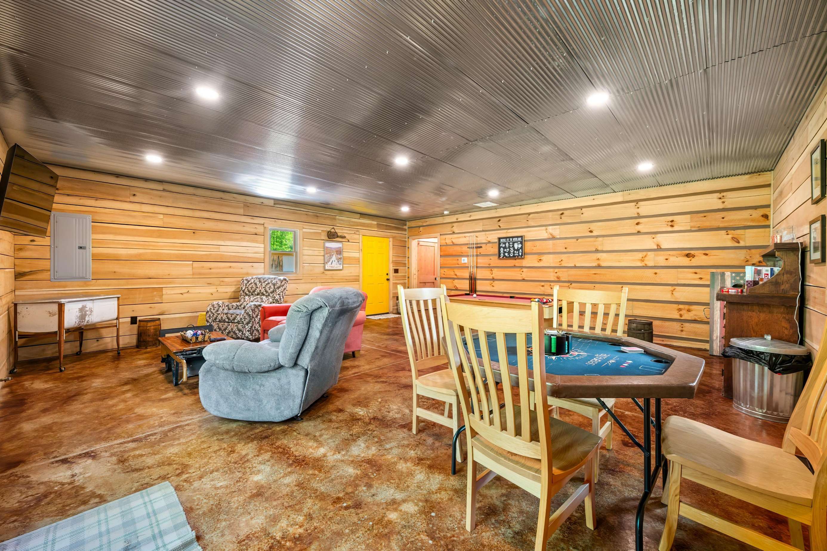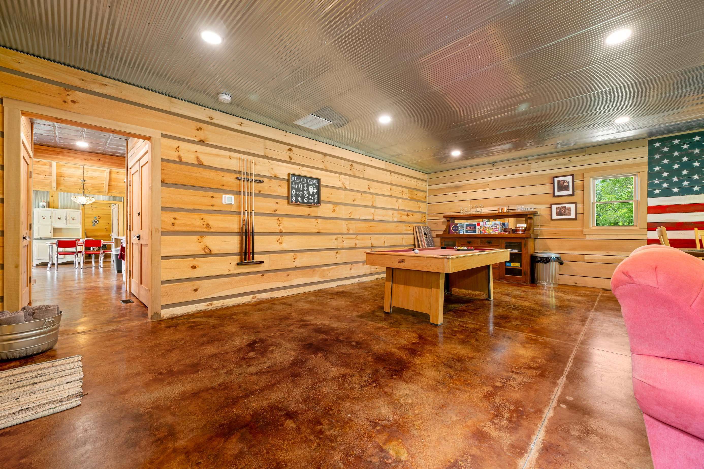 Wait for the best part - there is a HUGE game room fully equipped with a pool table, large screen TV, nice furniture and a place to park your mountain bikes inside. This is most likely where you will be spending your time. Have the kids pack their favorite games.