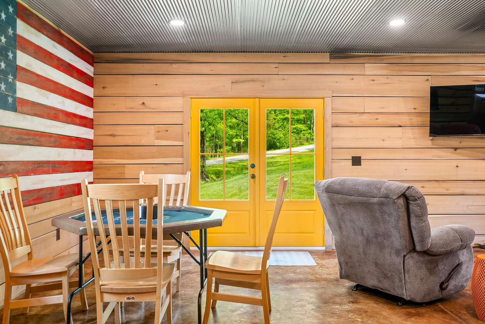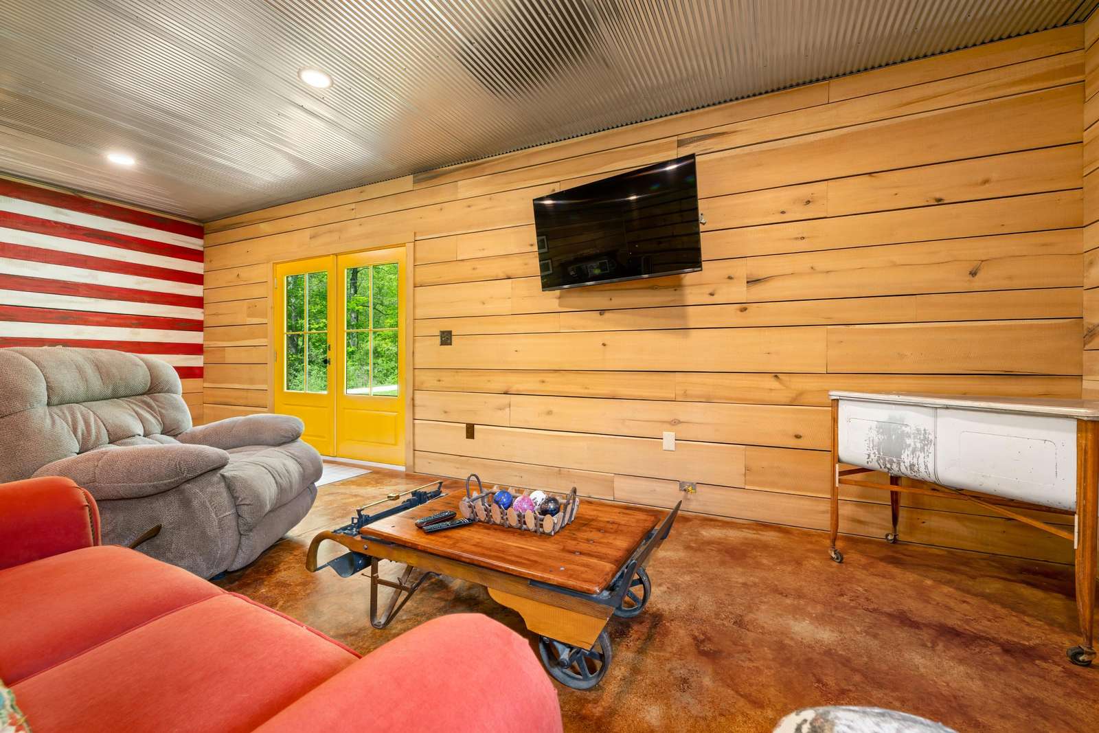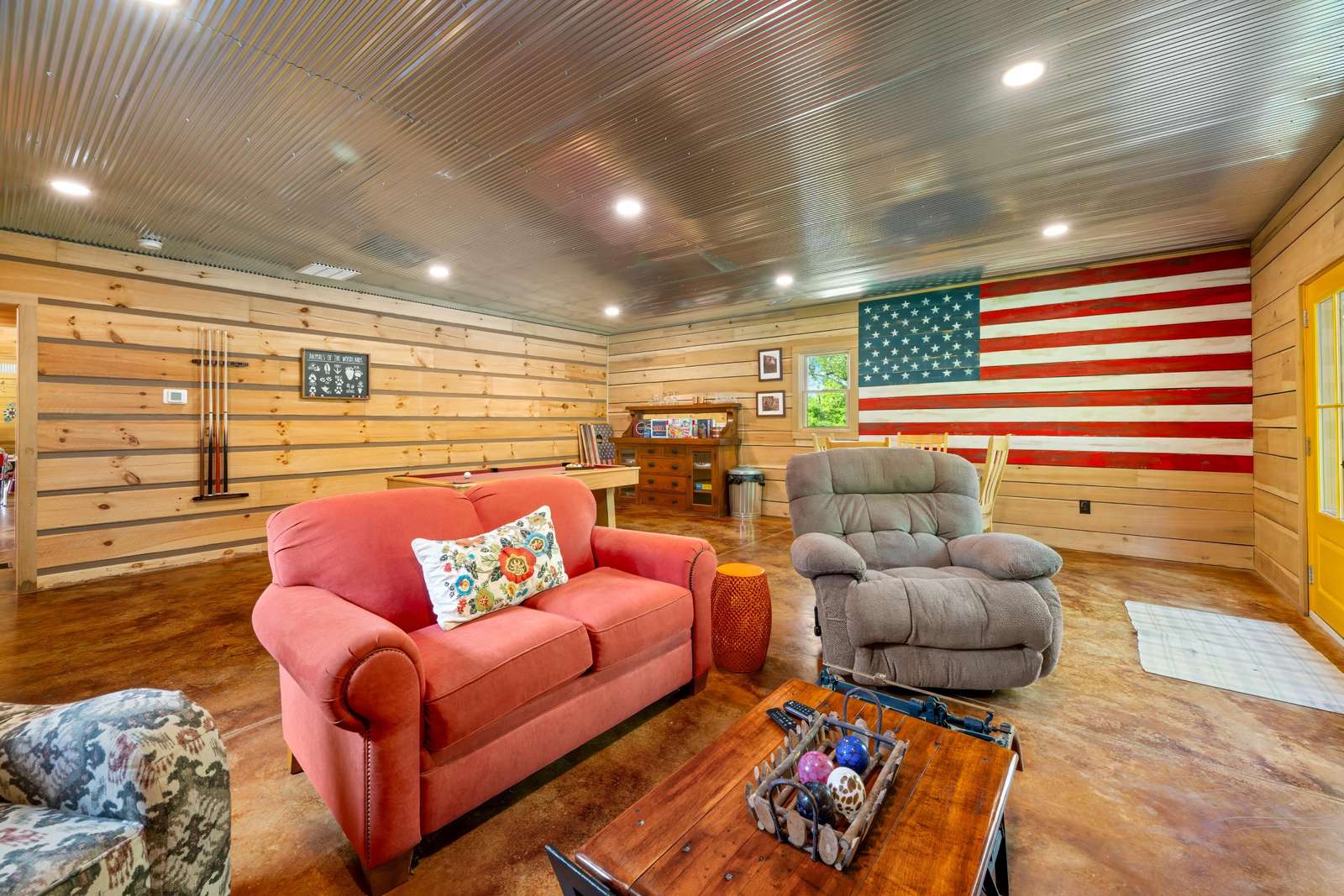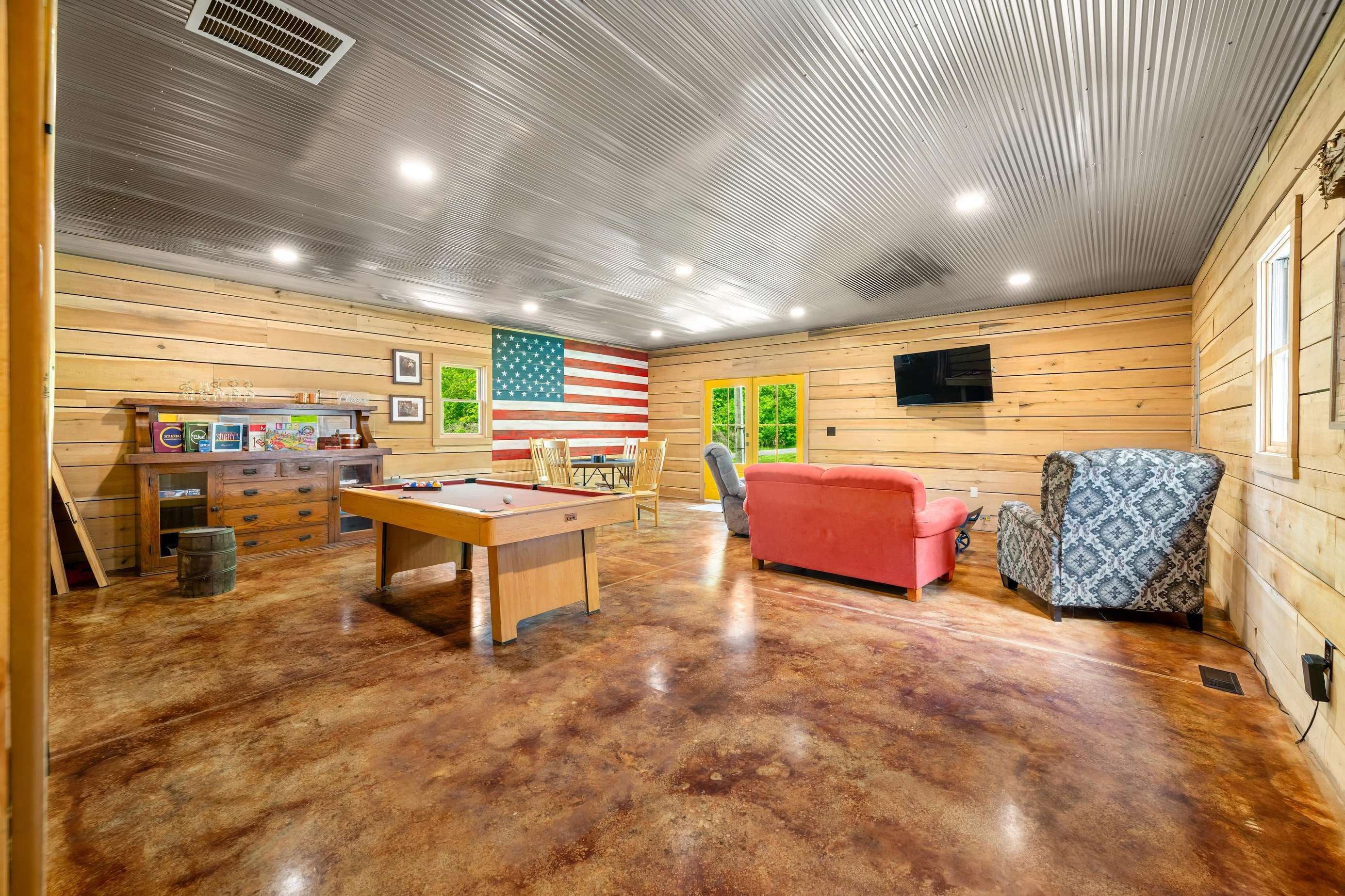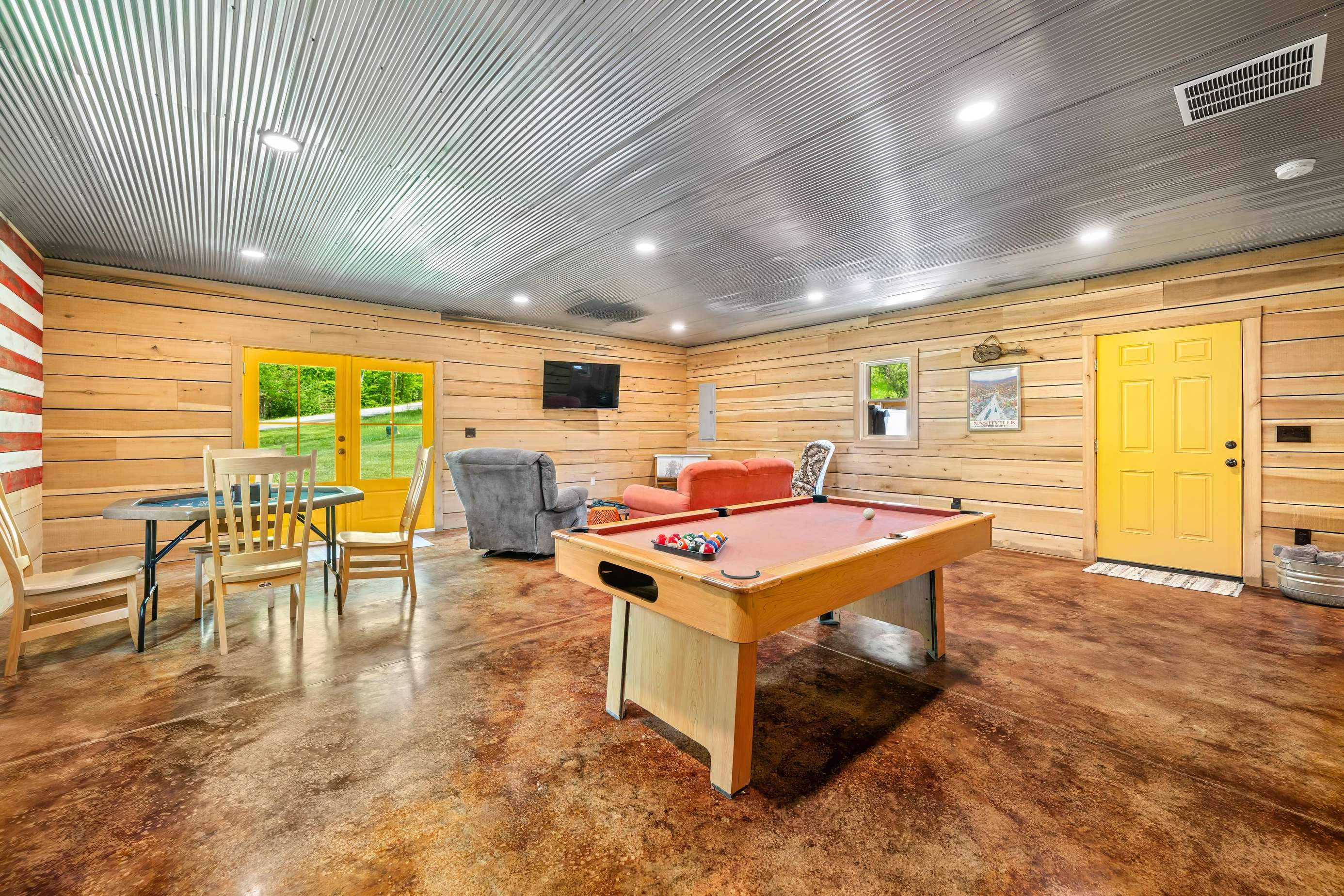 Game Room with pool table, large screen TV, comfy furniture, and indoor bike parking