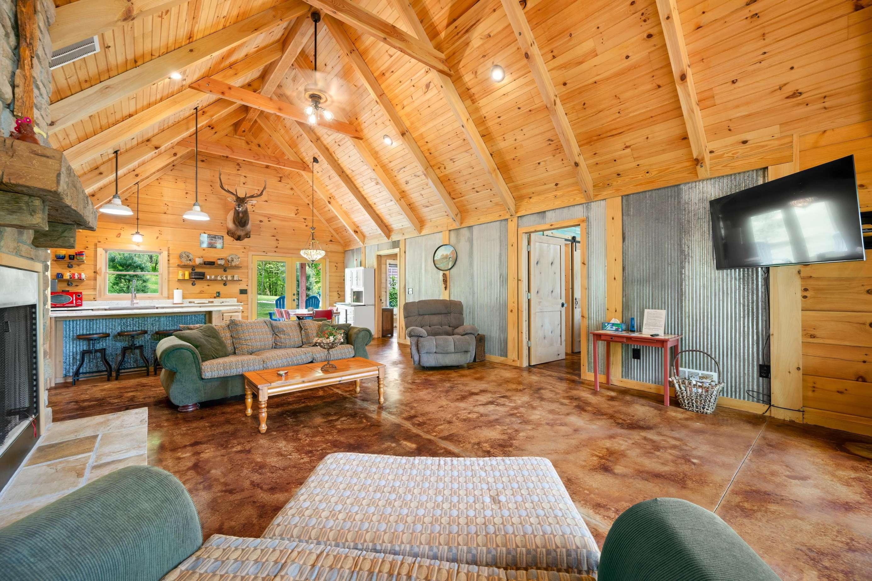 Expansive Great Room with smart TV, electric fireplace, and cozy seating