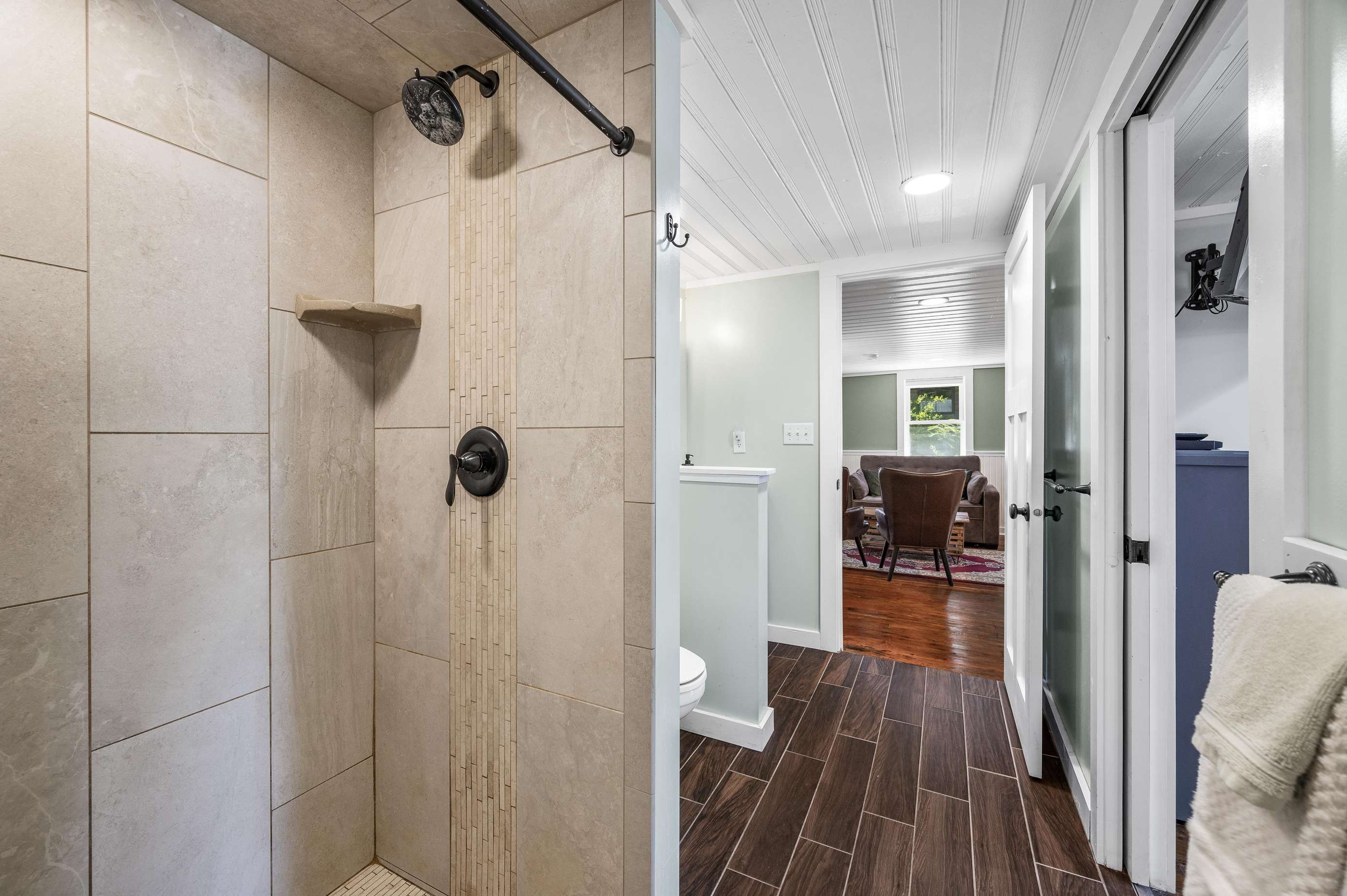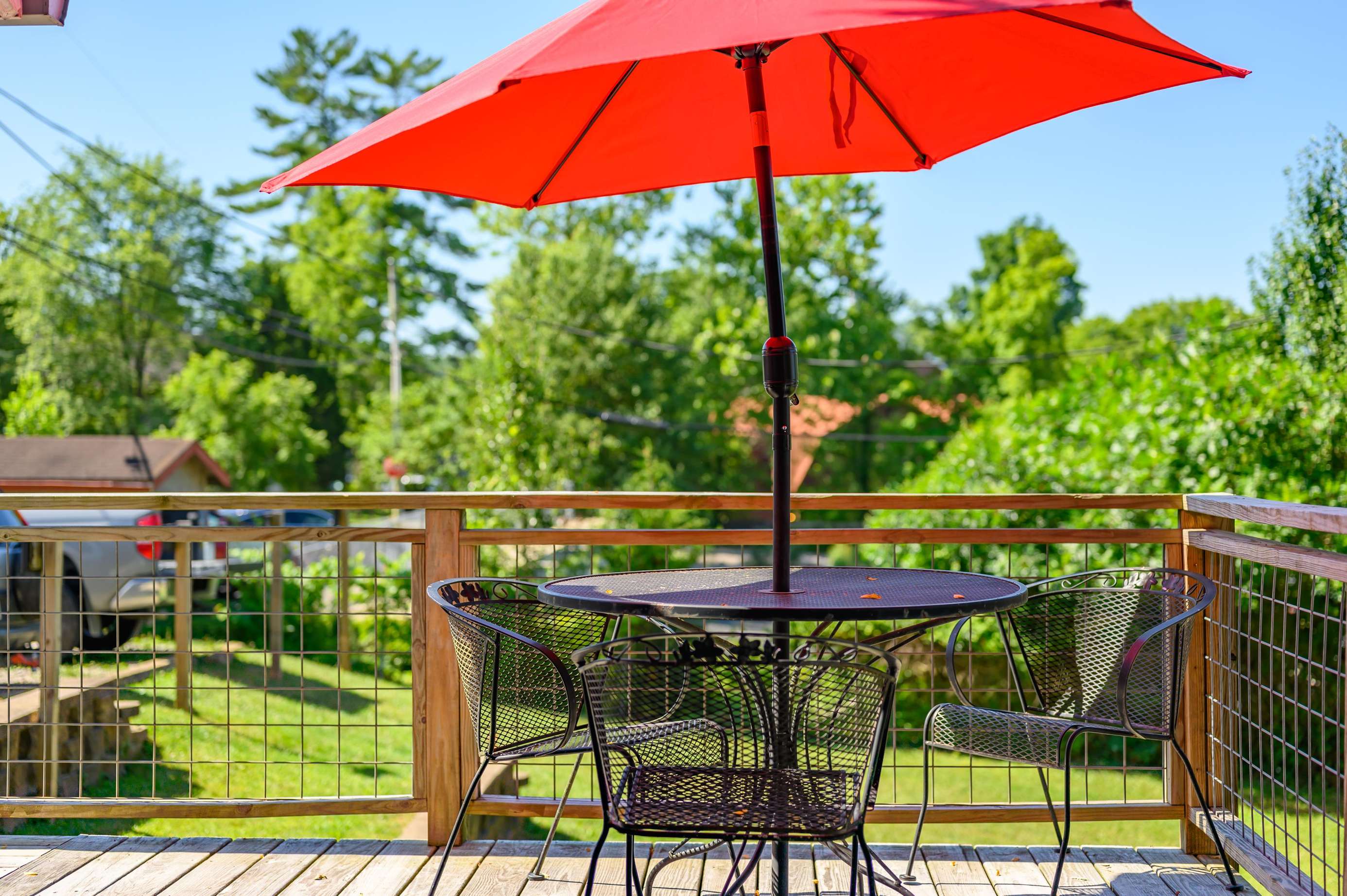 Buffalo Nickel is located on the north end of Nashville, giving visitors a view of downtown from the 300-square-foot deck with an overhanging black locust tree. The cabin comes with a full kitchen, breakfast bar, dining area, and hot tub. In the living room, guests will find a double sleeper sofa. The bathroom comes with a custom shower and access to the deck where guests will find the hot tub. The private bedroom also comes with a queen bed. Additionally, guests can relax in front of the two 32" televisions. Buffalo Nickel accommodates 2–4 people.