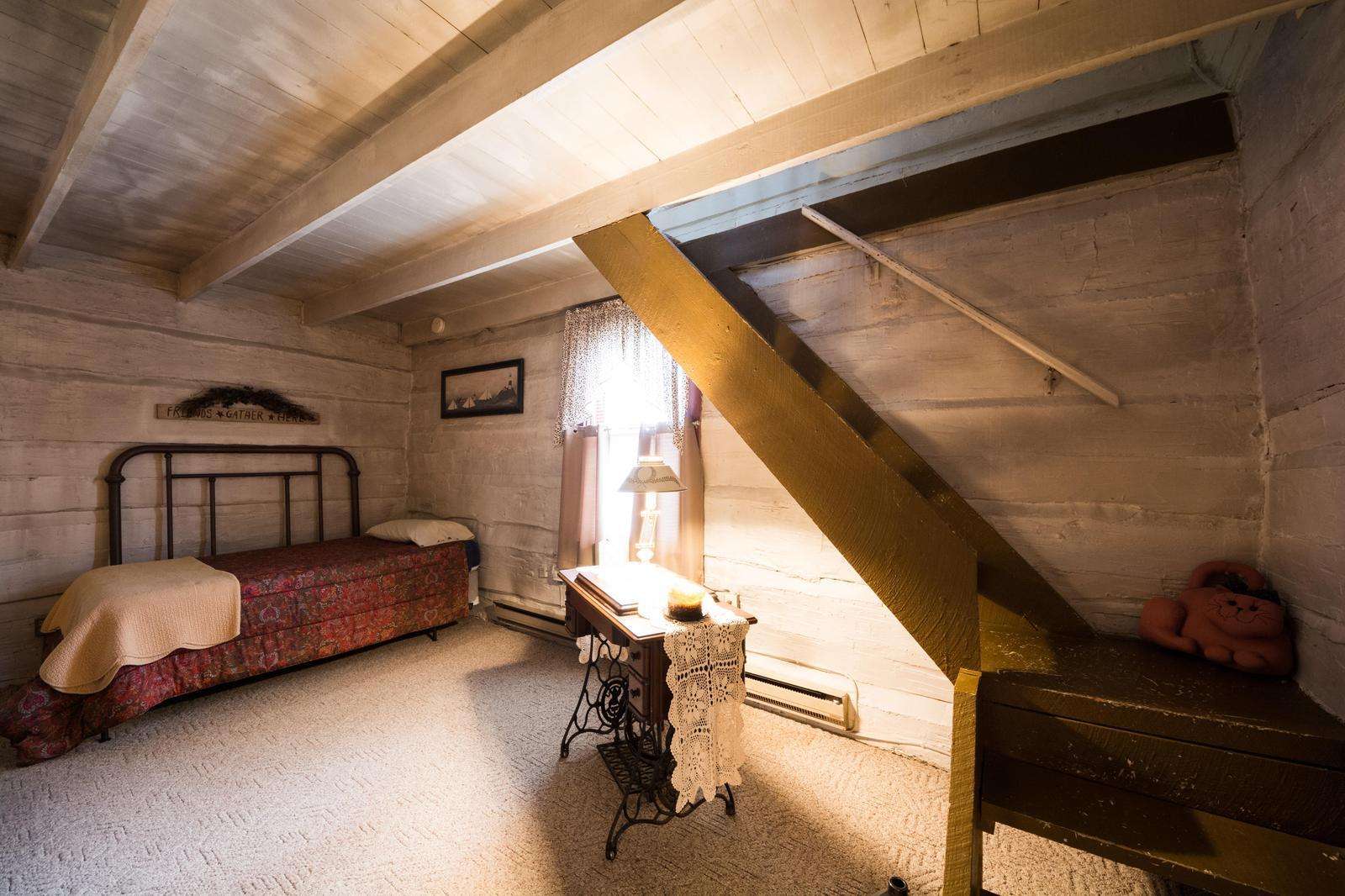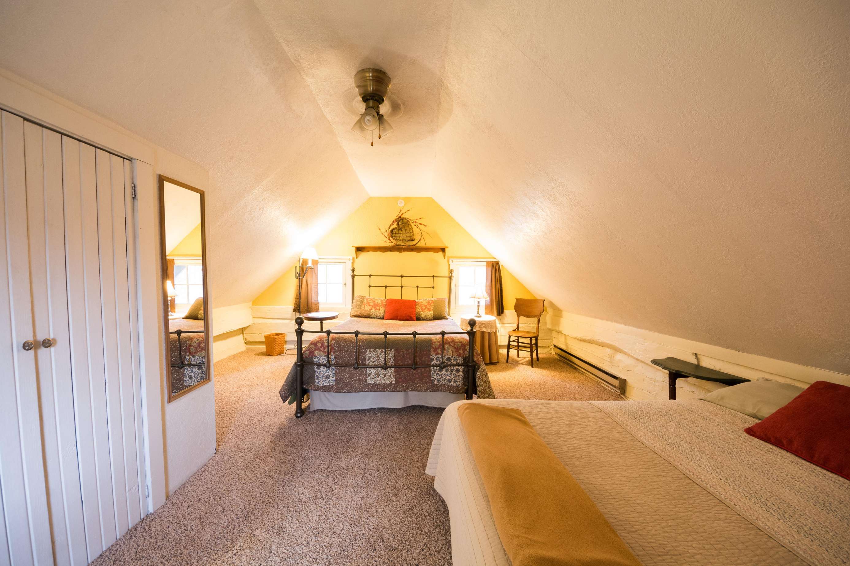 Climbing stairs is required to enter the property and access the second-level bedroom. Along with the queen-size and full-size beds in the upstairs bedroom, there is also a twin-size bed in the living room.