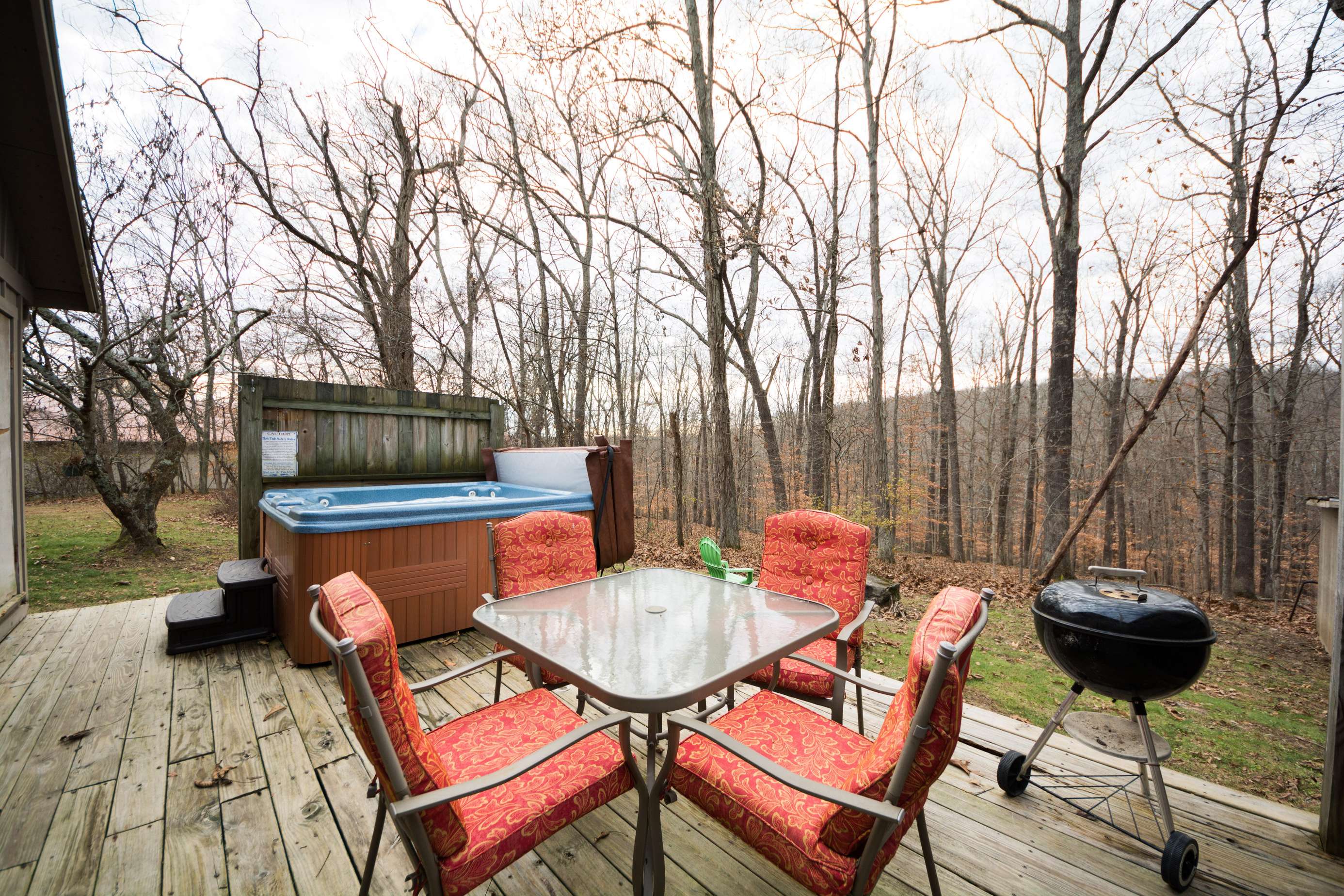 Daffodil Hill Log Cabin is a pet-friendly cabin that provides its guests with a serene environment filled with eight private acres of yard and woods, ideal for hiking or playing outdoors. Guests can enjoy the quiet surroundings while taking advantage of modern amenities such as a hot tub, fireplace, horseshoe pit, and a deck with breathtaking views of the hillside behind the cabin.