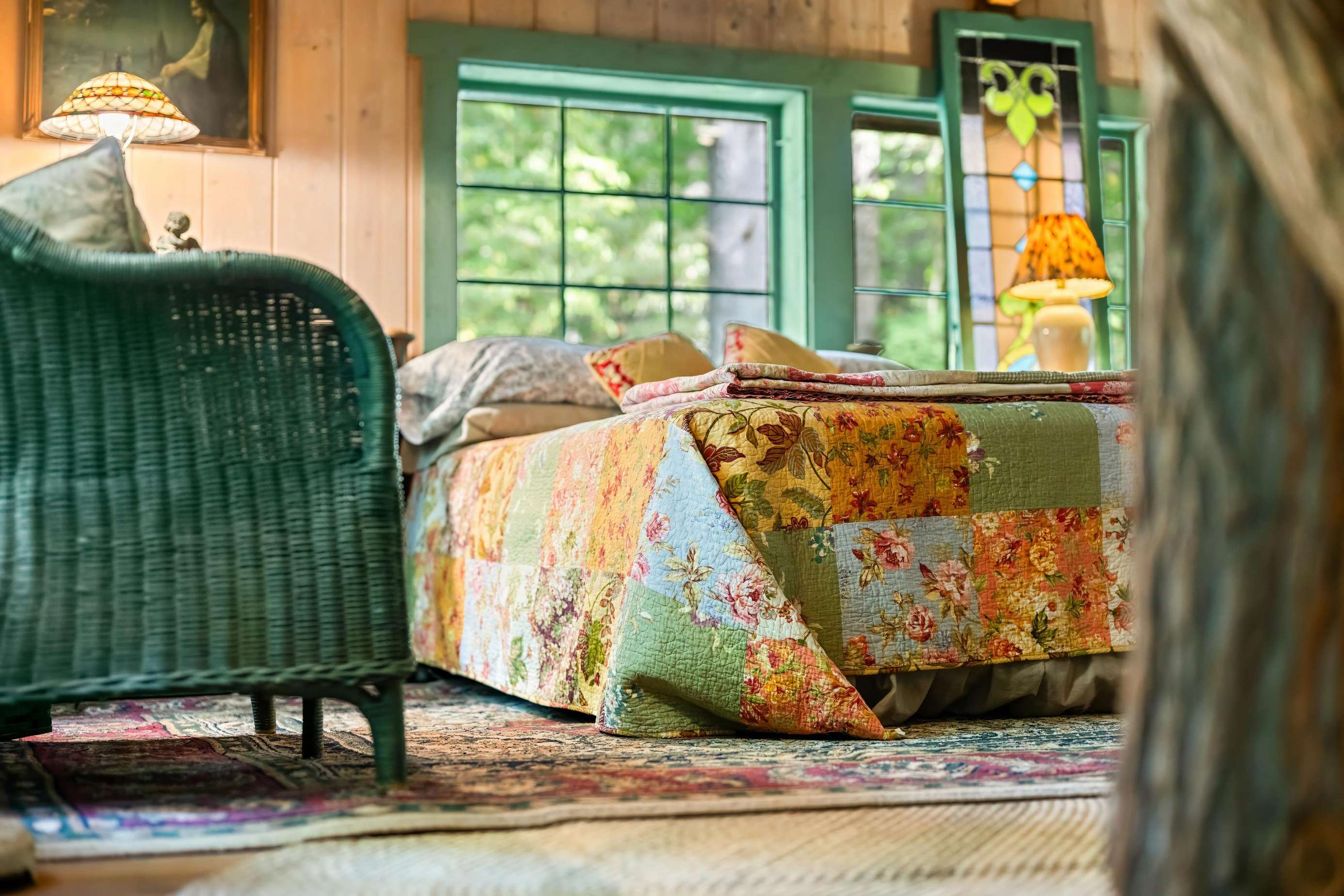 The Garden Cabin features one large country dining-kitchen-great room downstairs, with a spacious, many-windowed loft bedroom upstairs. Two large beds and an old wicker sitting-reading area overlook a huge Brown County stone fireplace.