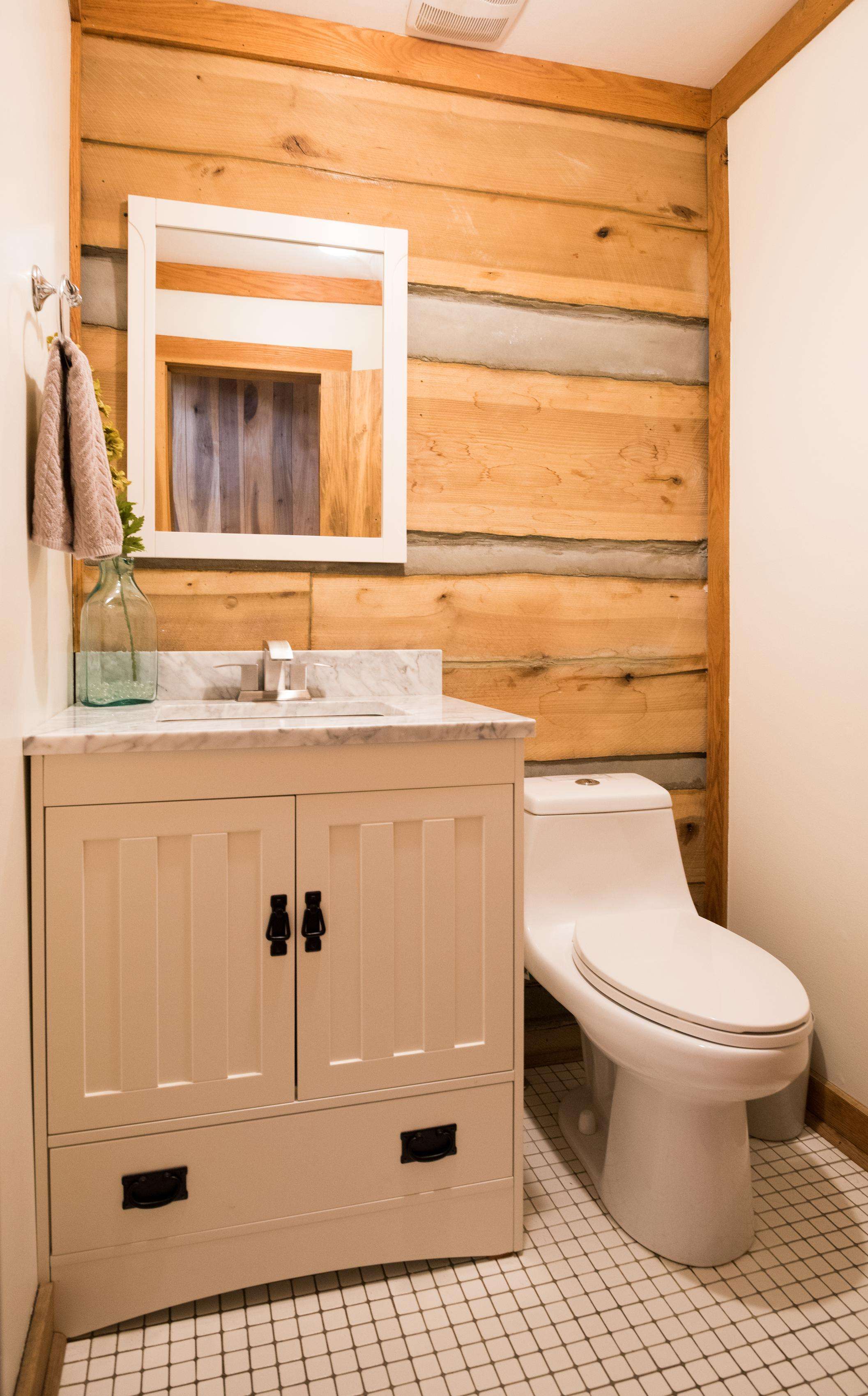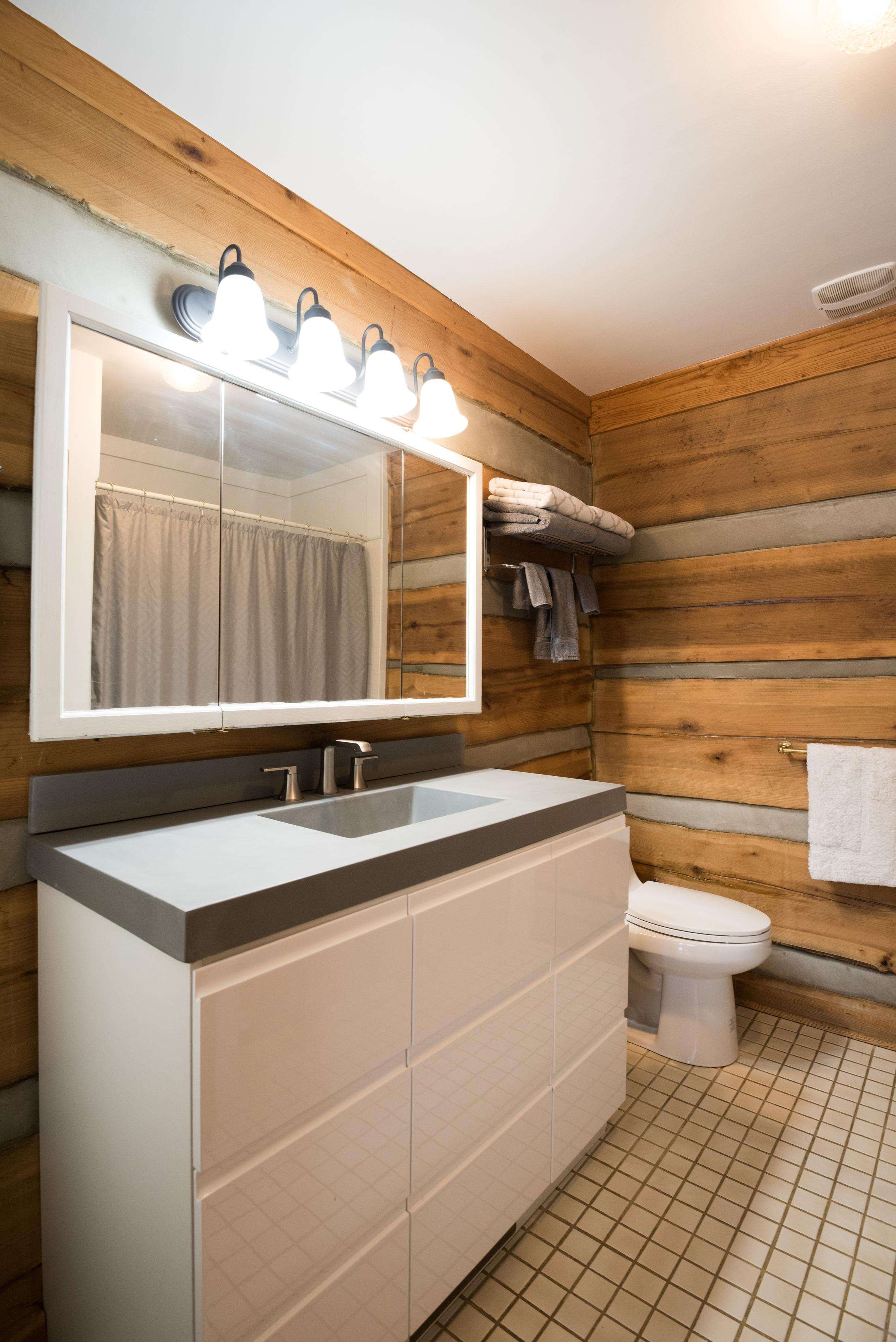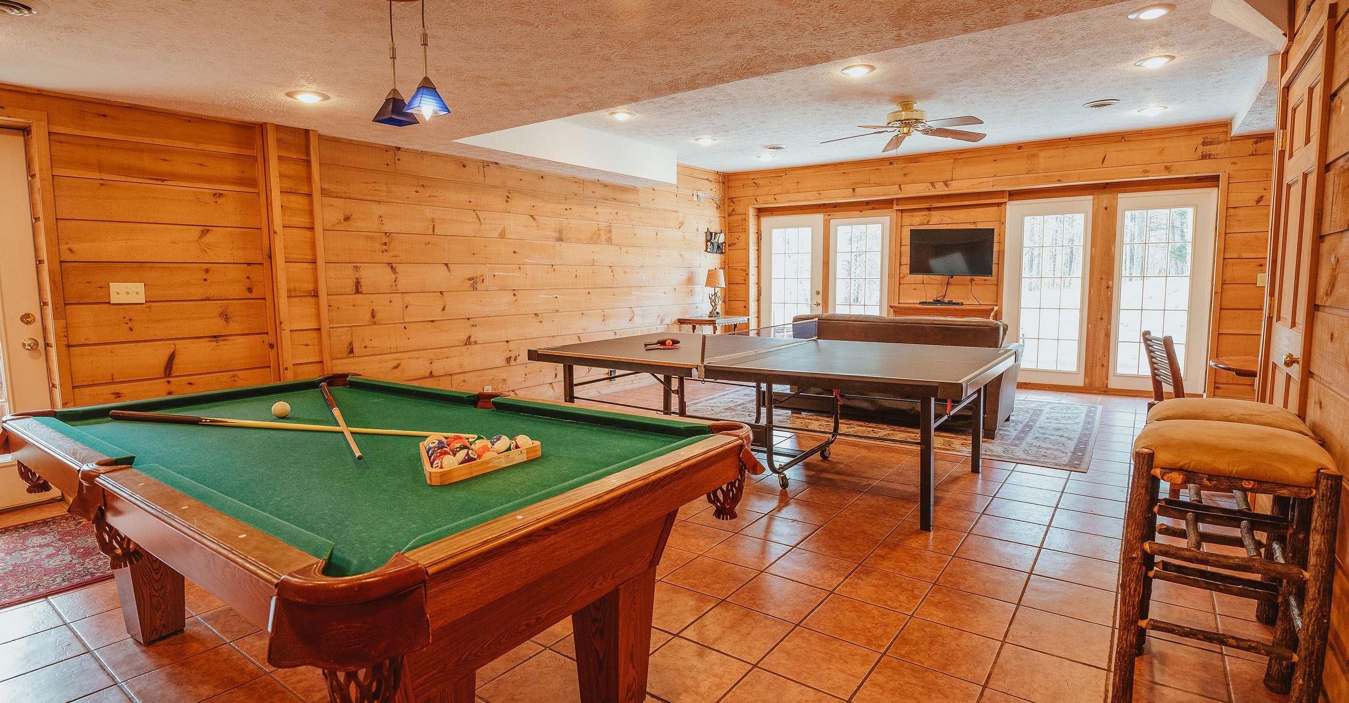 A covered front porch is also a place to gather. The ground-level patio features picnic tables and a fire pit for roasting hot dogs or marshmallows. Guests may enjoy the wood-burning fireplace while nestled in cabin-style living room furnishings. The lower level features a pool table, gas fireplace, TV, ping pong table, and access to a large screened porch, also equipped with picnic tables.