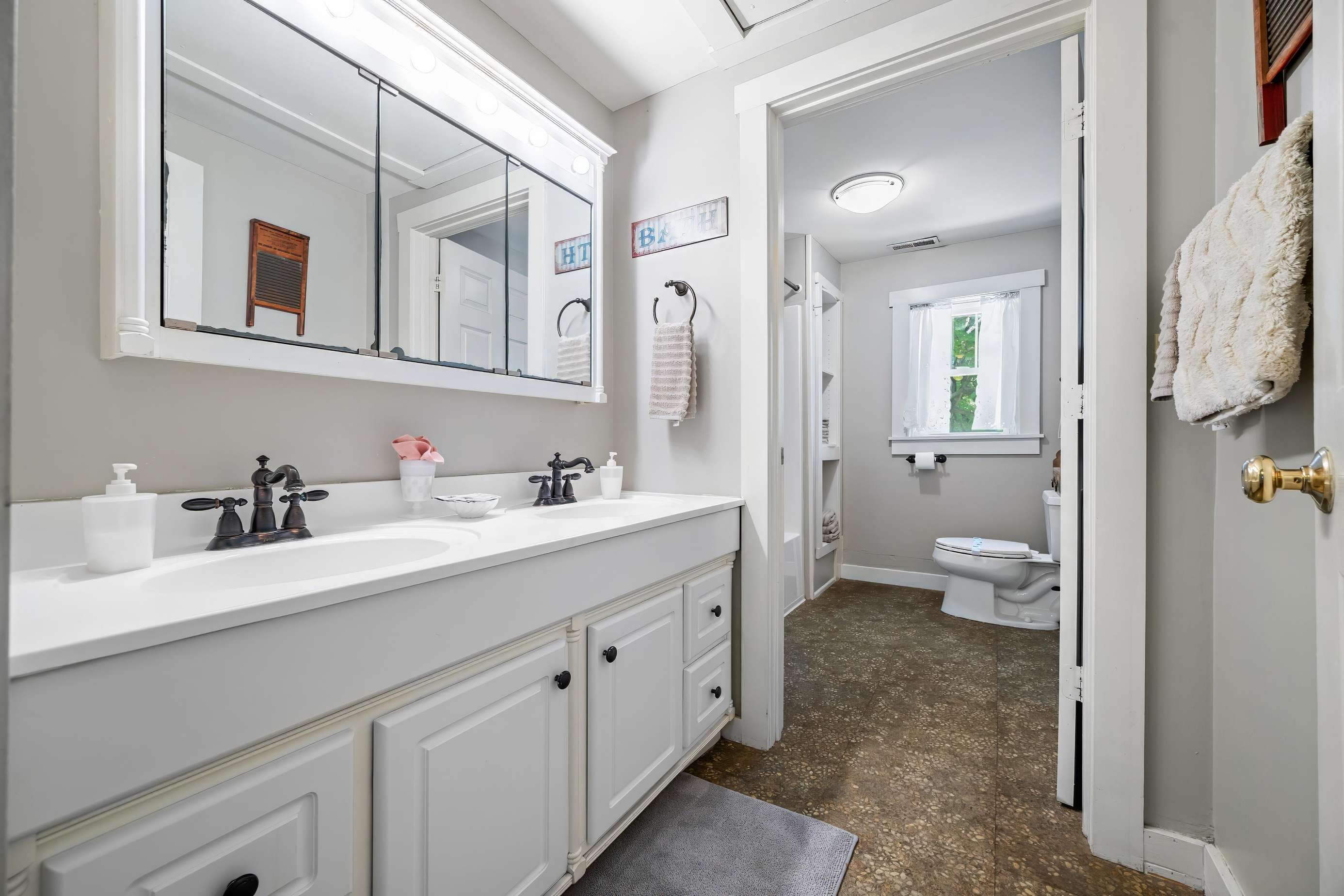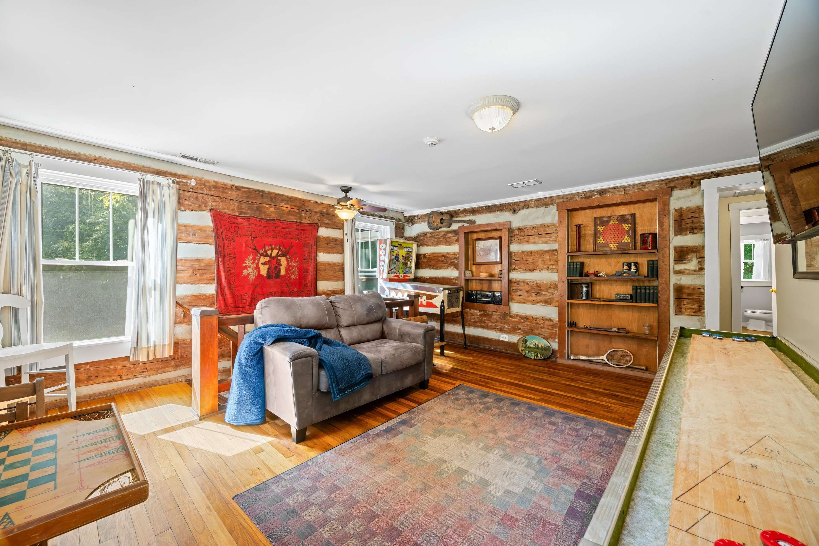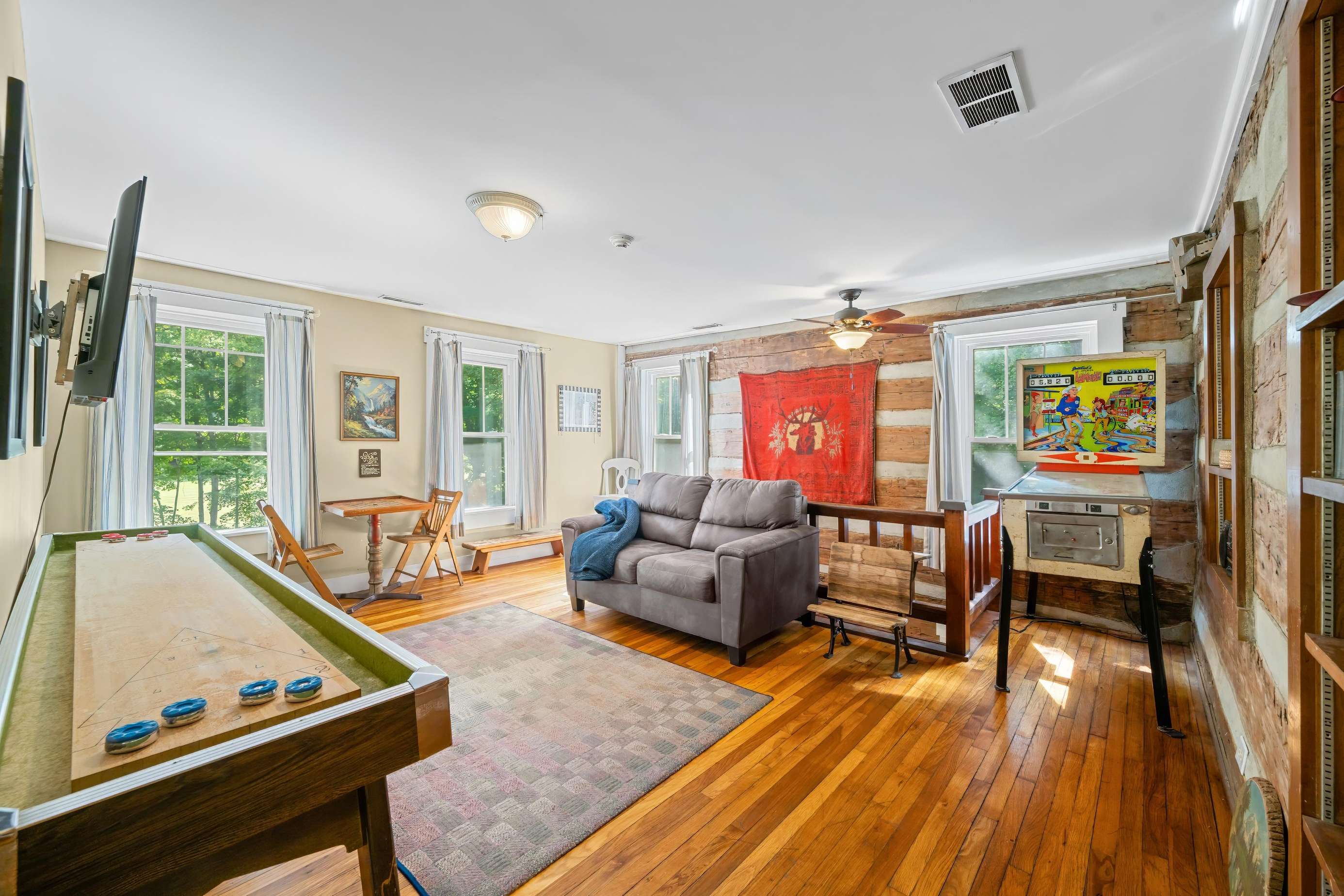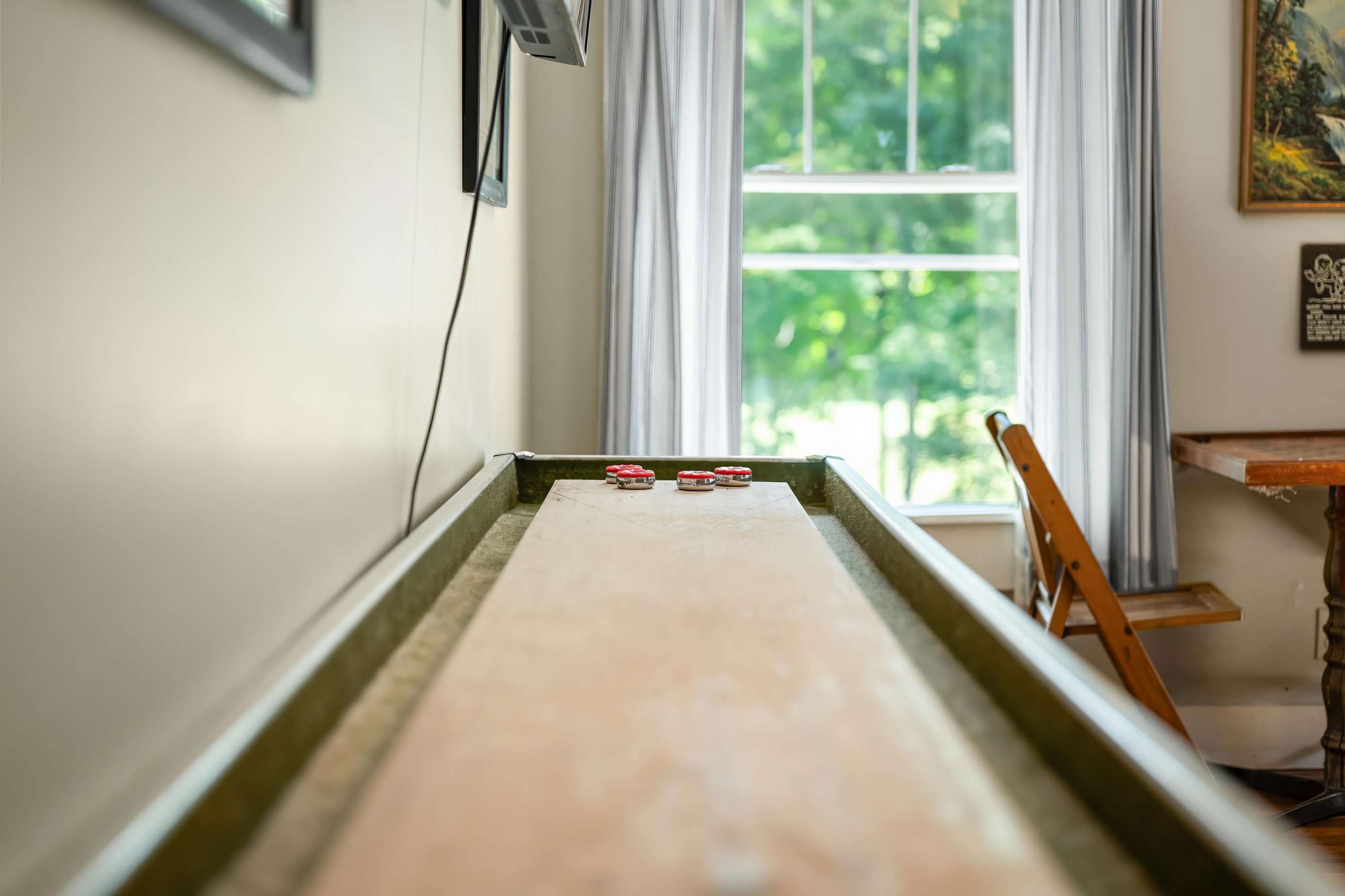 On the main floor, you will find the half bath off the dining room and the master king suite equipped with its own private bathroom and porch access. Meander up the stairs to the game room featuring a vintage shuffleboard and a flat-screen TV if you fancy watching your favorite movies or TV shows away from the rest of your group!