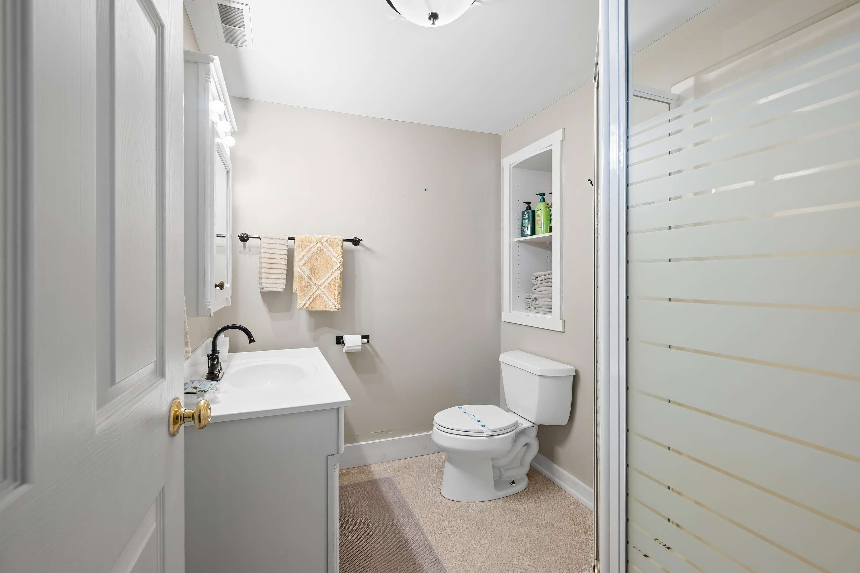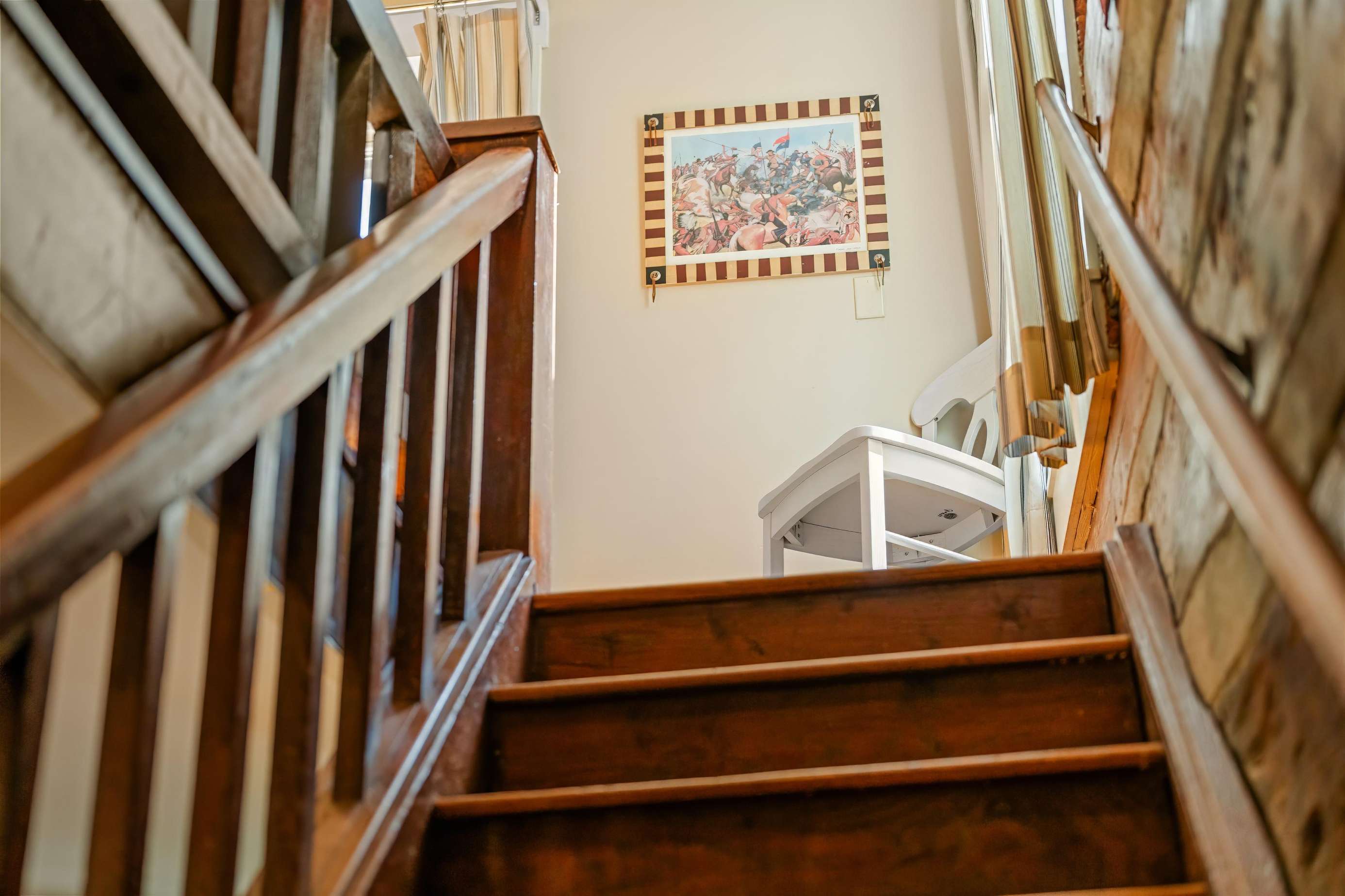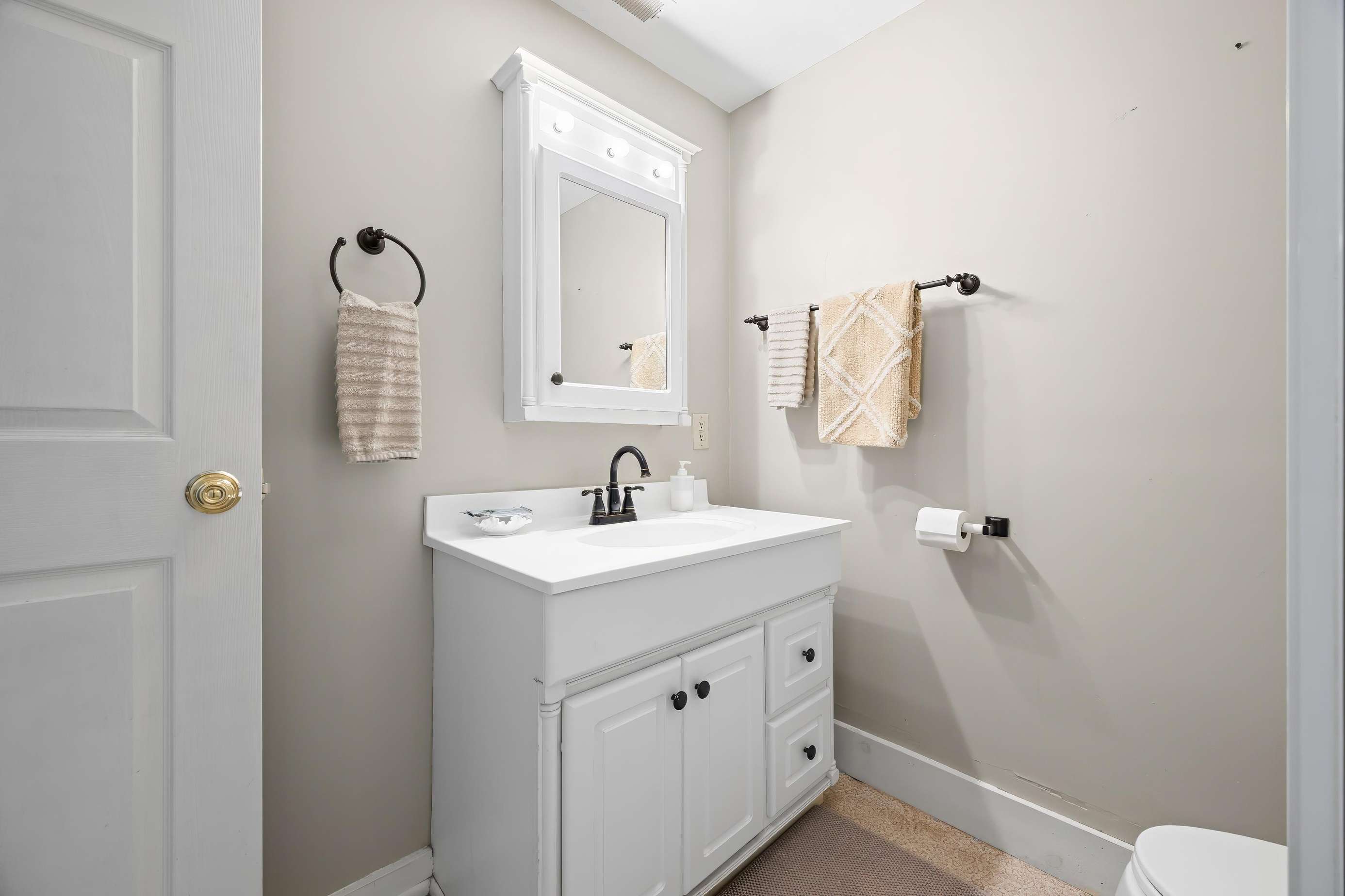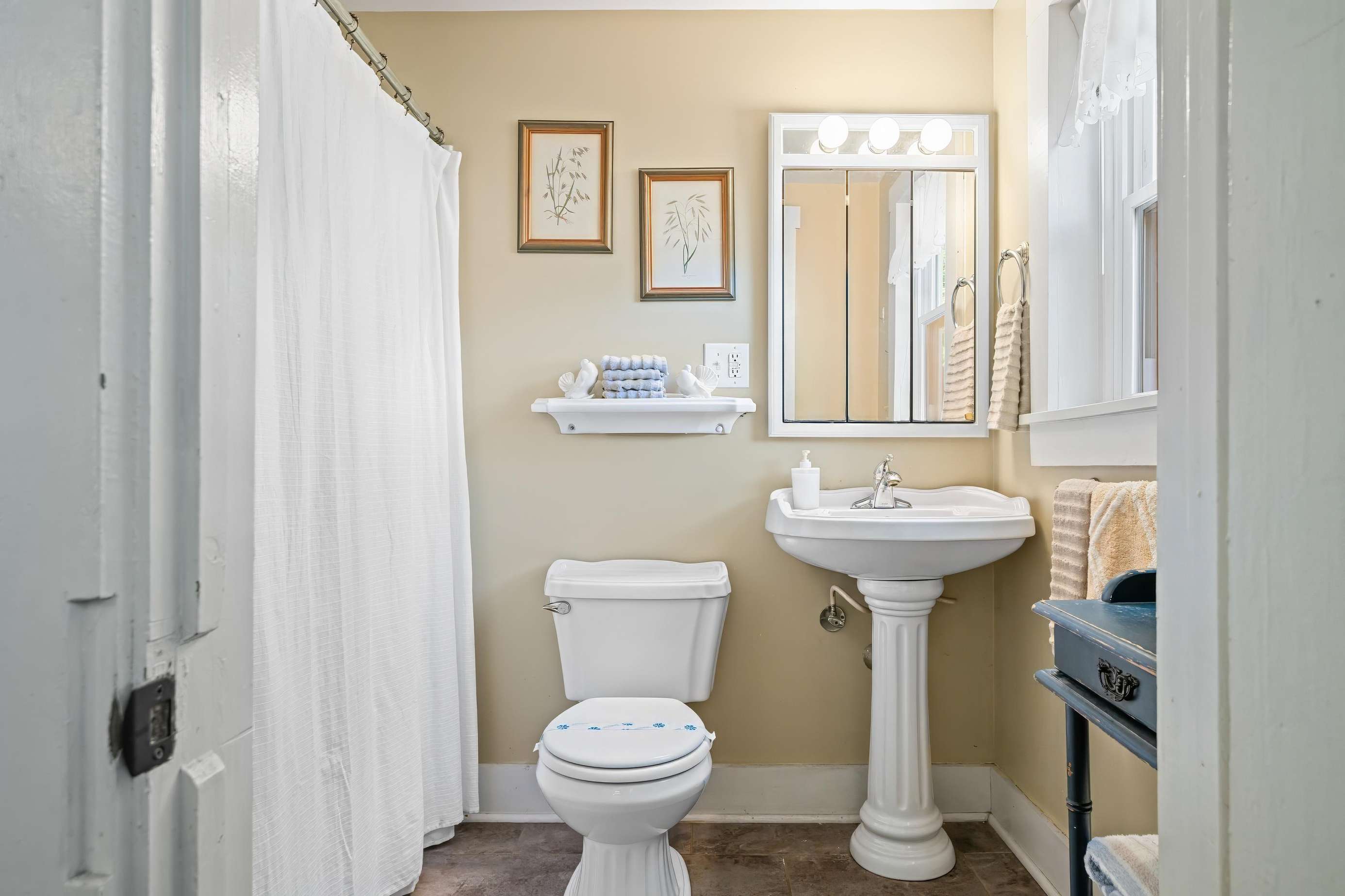 On the main floor, you will find the half bath off the dining room and the master king suite equipped with its own private bathroom and porch access. Meander up the stairs to the game room featuring a vintage shuffleboard and a flat-screen TV if you fancy watching your favorite movies or TV shows away from the rest of your group!