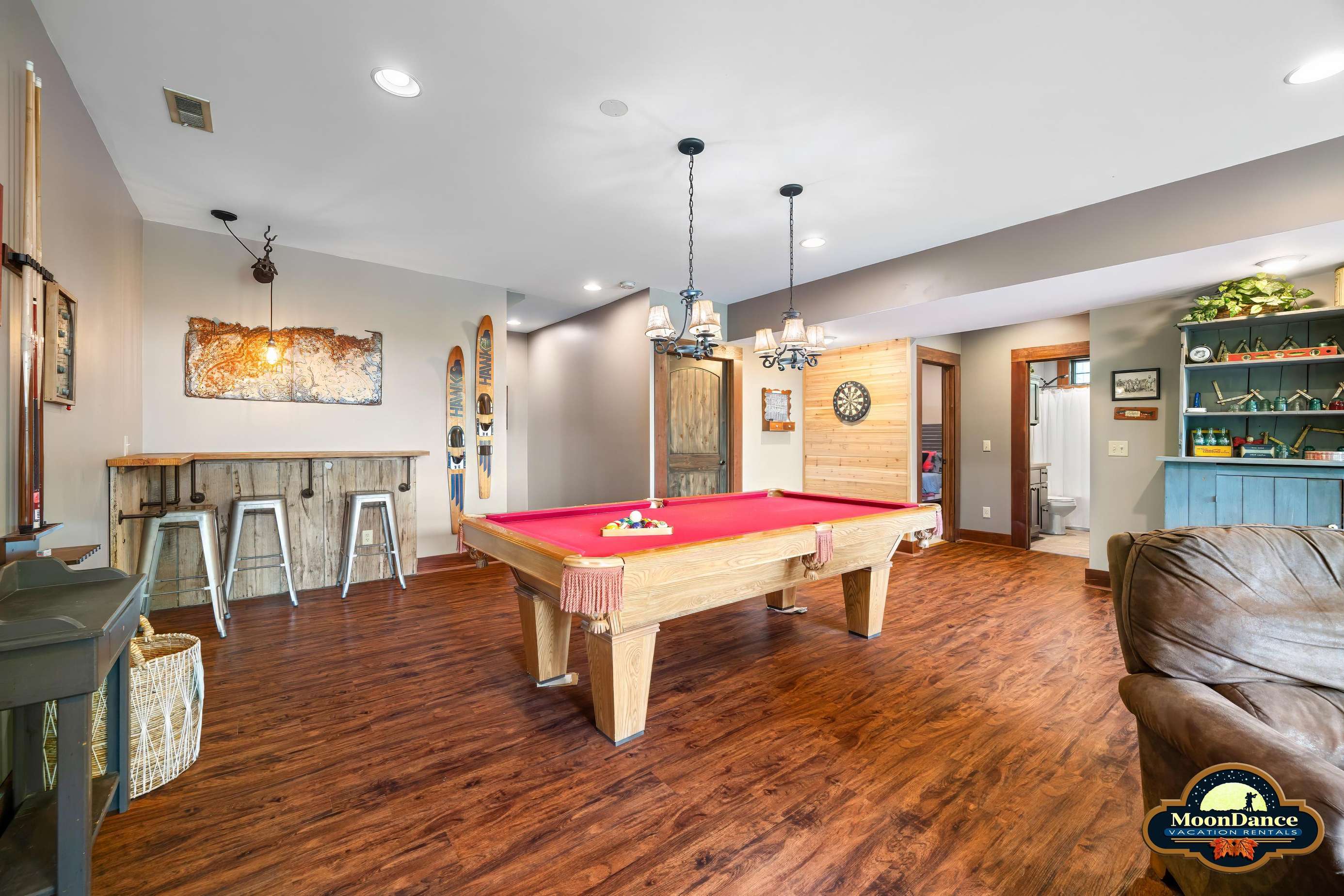 On the main level, you'll find two bedrooms where you can choose between a king or a queen-sized bed and a bathroom with a walk-in shower. Proceed downstairs, where you'll find two more bedrooms—one with a king bed, one with a queen-sized bed, and another with a full tub/shower. You'll also notice a game room with a pool table, a bar with stools, a game/snack table, and another fireplace to keep you warm while having fun!